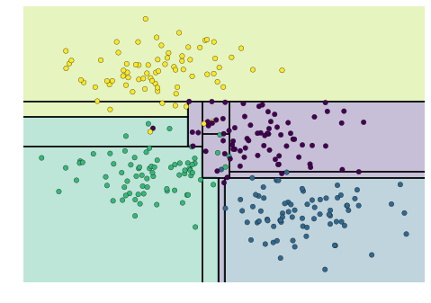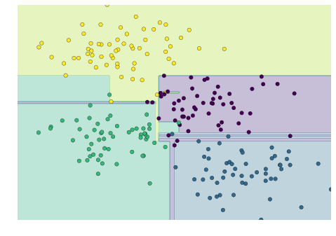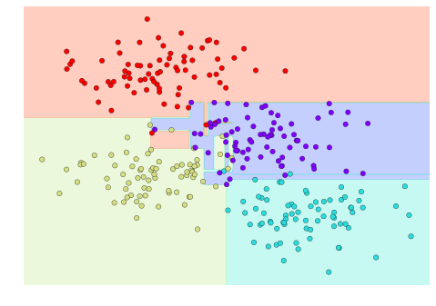 Notice that as the depth increases, we tend to get very strangely shaped classification regions; for example, at a depth of five, there is a tall and skinny purple region between the yellow and blue regions. It's clear that this is less a result of the true, intrinsic data distribution, and more a result of the particular sampling or noise properties of the data. That is, this decision tree, even at only five levels deep, is clearly over-fitting our data.