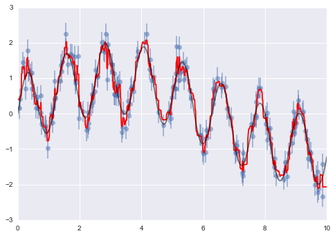 Here the true model is shown in the smooth gray curve, while the random forest model is shown by the jagged red curve. As you can see, the non-parametric random forest model is flexible enough to fit the multi-period data, without us needing to specifying a multi-period model!