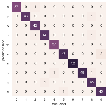 precision recall f1-score support 0 1.00 0.97 0.99 38 1 1.00 0.98 0.99 44 2 0.95 1.00 0.98 42 3 0.98 0.96 0.97 46 4 0.97 1.00 0.99 37 5 0.98 0.96 0.97 49 6 1.00 1.00 1.00 52 7 1.00 0.96 0.98 50 8 0.94 0.98 0.96 46 9 0.96 0.98 0.97 46 avg / total 0.98 0.98 0.98 450